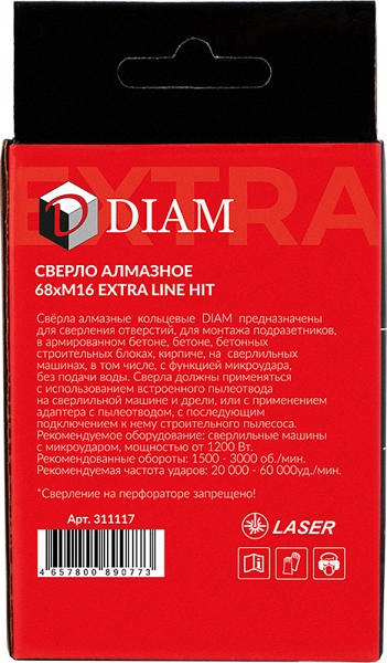 Цена и технические характеристики алмазной коронки с пылеудалением для сухого сверления с микроударом подрозетников Diam Extra Line Hit 68 мм:
