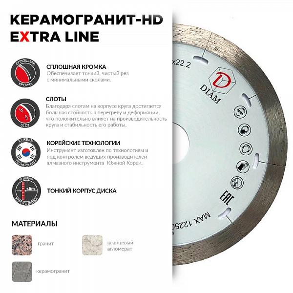 Преимущества алмазного отрезного круга Diam Extra Line 1A1R Корона Керамогранит-HD 125 мм: