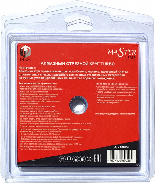 Алмазный отрезной круг Diam Master Line Turbo Master 125 мм (Диам Мастер Лайн Турбо Мастер 125 мм) – профессиональный алмазный диск для сухой резки бетона, слабоармированного бетона, огнеупоров, кирпича, тротуарной плитки, общестроительных материалов.