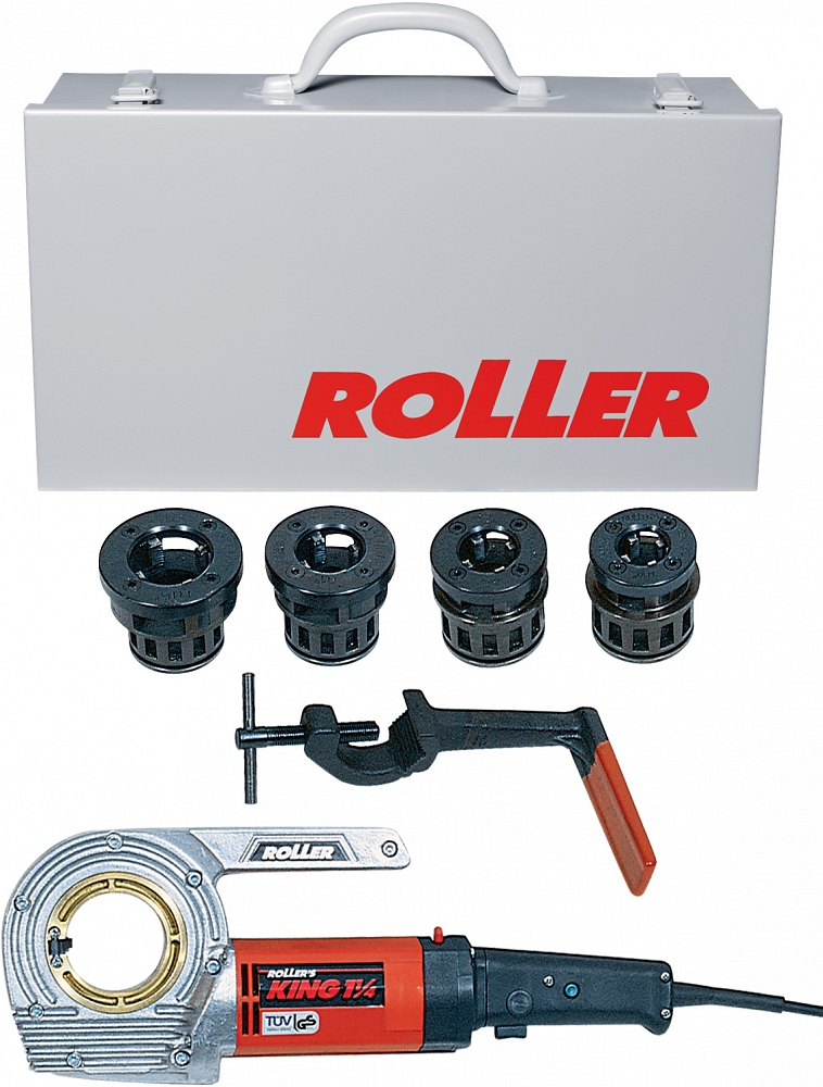- Roller Кинг 1 1/4 Сет A/C. Привод, бугель для зажима труб, быстросменные резьбонарезные головки Рола-Автоматик R 1/2", 3/4" и Централ R 1", 1 1/4", в прочном стальном чемодане