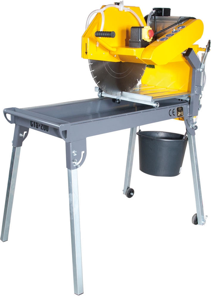 Камнерезный станок Cedima CTS-200 (Цедима ЦТС-200) – передвигаемая с помощью роликов, закрепляемых на раму или на парно откидываемые опорные ножки, настольная пила для мокрой резки кирпича, клинкера, плитки, кафеля, мраморных плит, натурального камня, плит из промывного бетона, брусчатки и других подобных абразивных строительных материалов длиной до 610 мм, толщиной до 200 мм, под прямым углом, на роликовом столе с неподвижной измерительной шкалой и подвижно закрепляемым боковым упором для заготовок. Сравнительно легкая, но прочная, легко транспортируемая настольная пила с большой глубиной резки для применения на строительных площадках.
