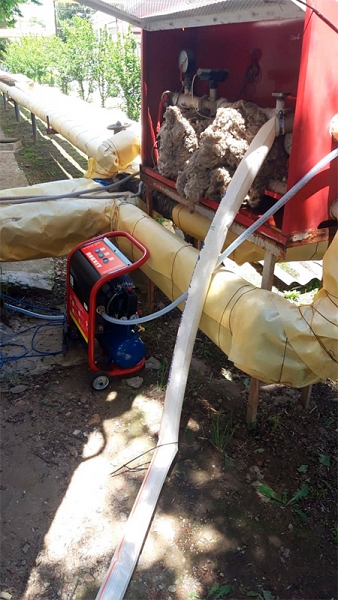 Систему необходимо полностью заполнить водой. Установку включают в импульсный режим подачи воздуха. Продолжительность включения примерно 15 мин. По окончании цикла необходимо открыть спускной вентиль и выпустить воду вместе с отложениями и загрязнениями из системы. После нескольких таких циклов трубопровод очищается практически полностью. - Проточный метод: