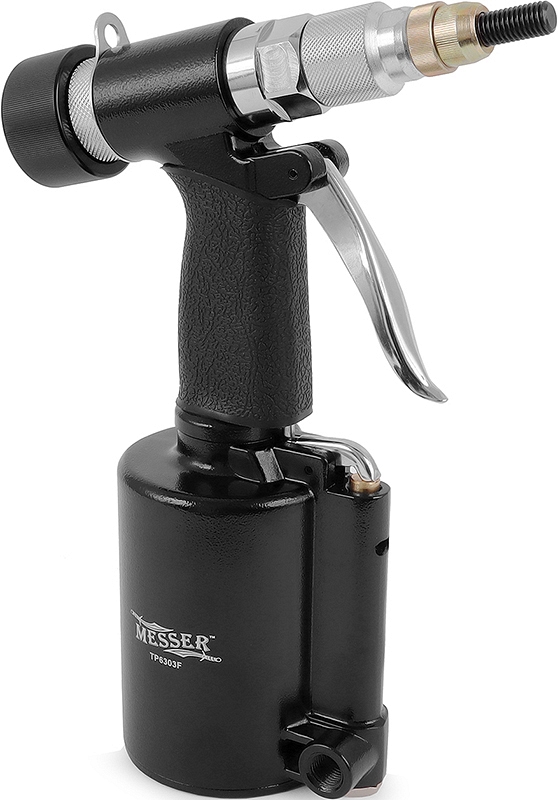 Пневматический заклепочник для резьбовых заклепок Messer TP6303F (Мессер ТП6303Ф) – надежный профессиональный резьбовой пневмозаклепочник (пневмо заклепочный пистолет) для установки алюминиевых и стальных резьбовых заклепок типоразмером М4, М5, М6, М8, М10; нержавеющих стальных резьбовых заклепок типоразмером М4, М5, М6.