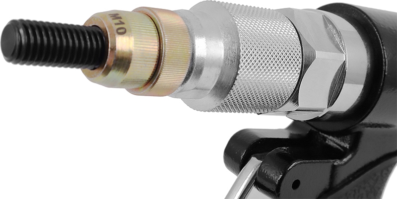 - Сжимание заклепки происходит посредством втягивания штока, что помогает сохранять резьбу заклепки, увеличивает ресурс самого инструмента и значительно уменьшает время установки заклепки