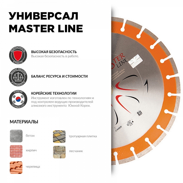 Сегментный алмазный круг Diam Master Line 1A1RSS Универсал 450 мм (Диам Мастер Лайн 1А1РСС Универсал 450 мм) – специальный алмазный отрезной диск с лазерной сваркой сегментов для сухой и мокрой резки бетона, тротуарной плитки, кирпича, черепицы, песчаника, природного и искусственного камня, строительных материалов общего назначения на камнерезных станках, стенорезных машинах, швонарезчиках, с подачей и без подачи воды.